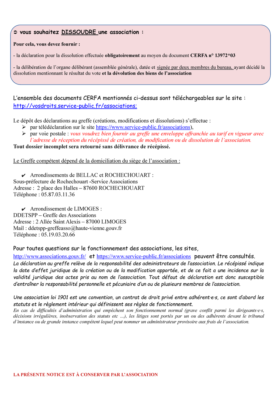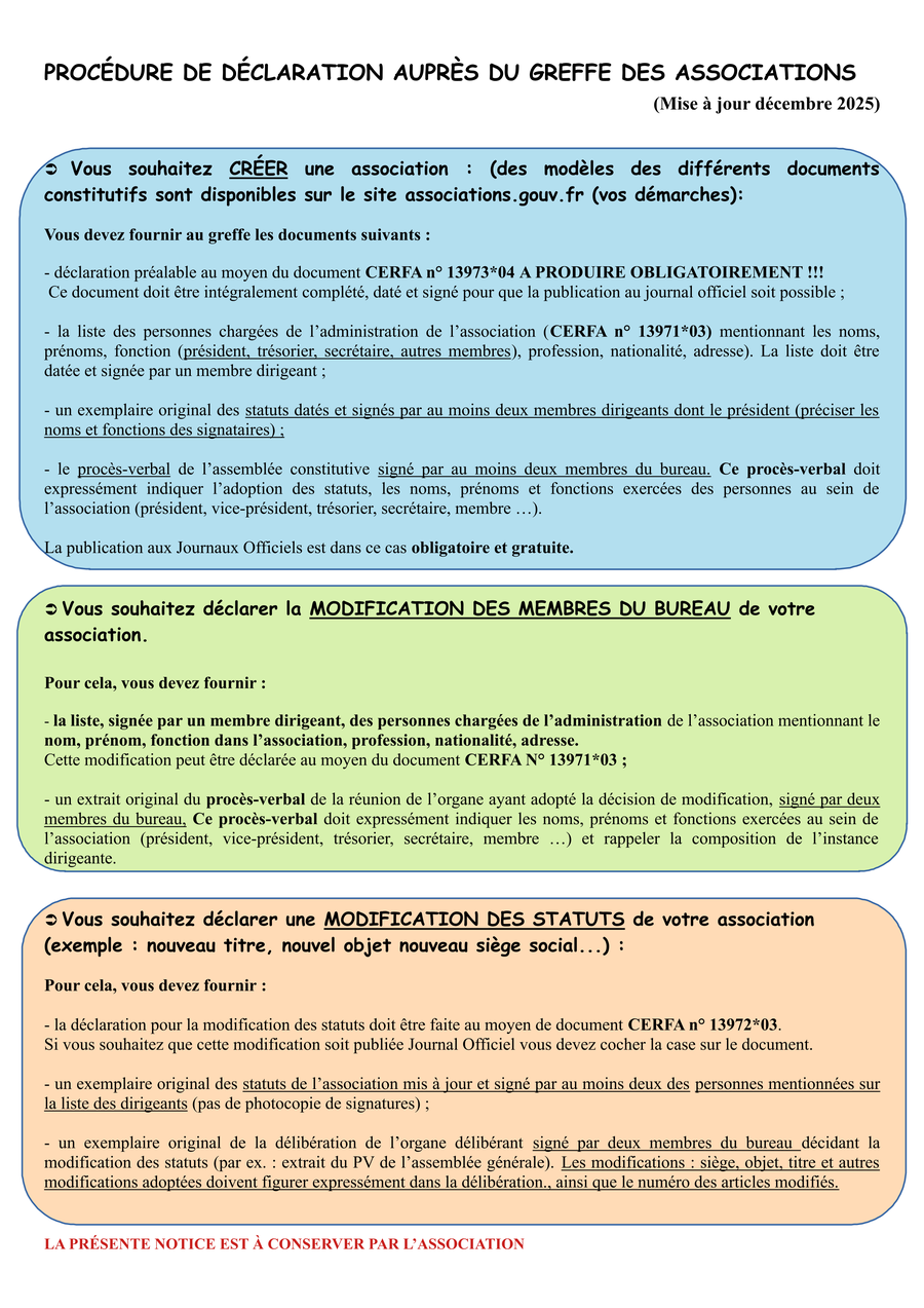 Vous trouverez ci-joint, une notice d'information reprenant les démarches que doivent effectuer les associations Loi 1901 en cas de création, modification ou dissolution, auprès du greffe des associations.