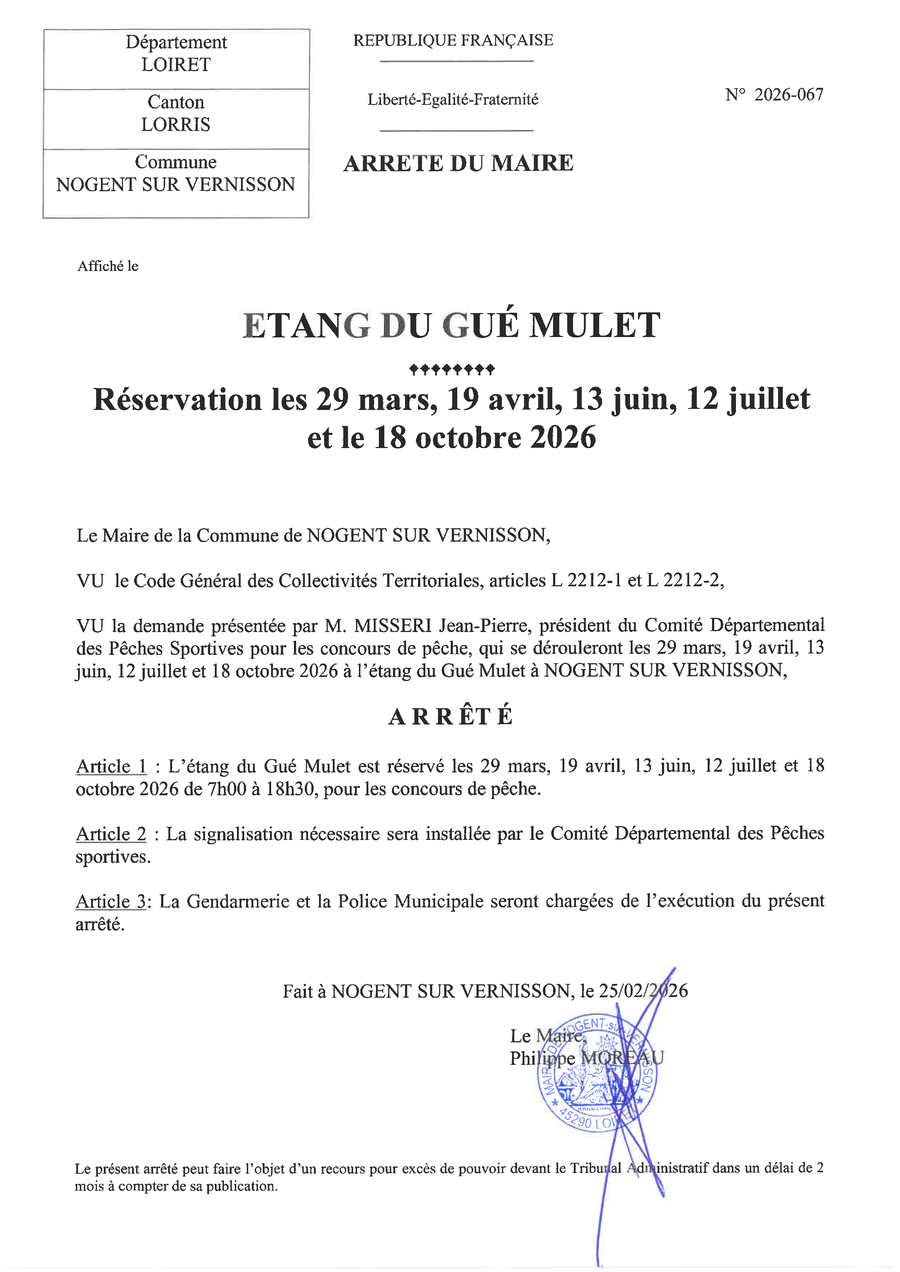 L'étang du Gué Mulet est réservé le dimanche 19 avril de 7 h à 18 h 30 pour le concours de pêche organisé par le Comité Départemental des Pêches Sportives