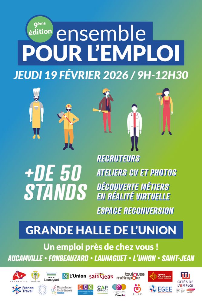 Les communes d’Aucamville, Fonbeauzard, Launaguet, L’Union et Saint-Jean s’unissent une nouvelle fois pour organiser la 9ᵉ édition du Forum intercommunal pour l’emploi, qui se tiendra le jeudi 19 février 2026, de 9 h à 12 h 30, à la Grande Halle de L’Union.