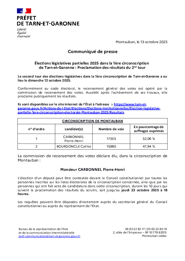 Ils sont disponibles sur le site internet de l’État à l’adresse suivante > https://www.tarn-et-garonne.gouv.fr/Actions-de-l-Etat/Elections/Elections-Institutionnelles/Election-legislative-partielle-1ere-circonscription-electorale-Montauban-2025/Resultat