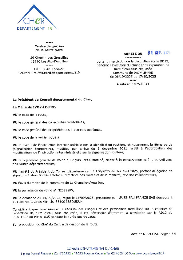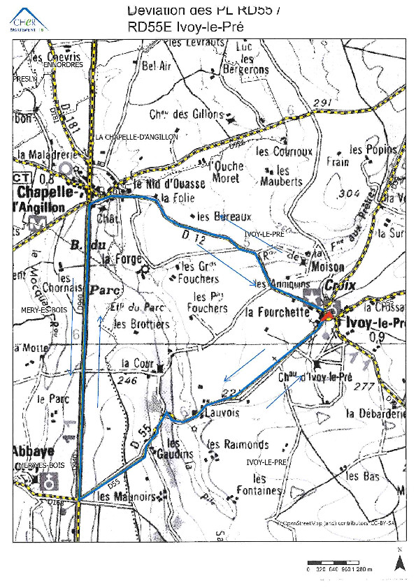 En raison de travaux pour fuite d'eau sous chaussée dans le bourg d'Ivoy-le-Pré, la circulation sera déviée du 06 au 17 octobre 2025 comme sur le plan ci-dessous.