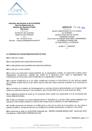 L'arrêté du 30 janvier 2026 portant réglementation de la circulation sur la RD940 pendant l'exécution du chantier d'abattage d'arbres entre La Chapelle-d'Angillon et Aubigny-sur-Nère du 15 au 27 février 2026 est consultable ci après et en mairie.