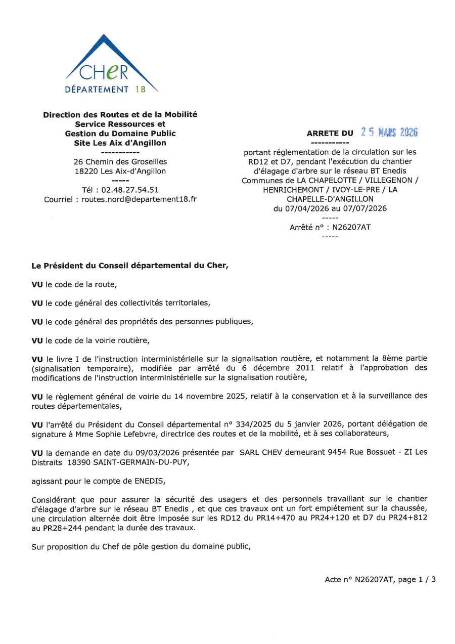 Des travaux pour élagage d'arbres sur le réseau ENEDIS sont prévus entre le 07 avril et le 07 juillet 2026 sur la RD12 sur les communes de