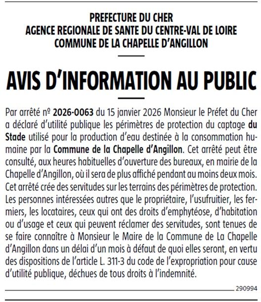 Les périmètres du captage du stade pour la production d'eau destinée à la consommation humaine ont été déclarés d'utilité publique par Monsieur le Préfet en date du 15 janvier 2026.