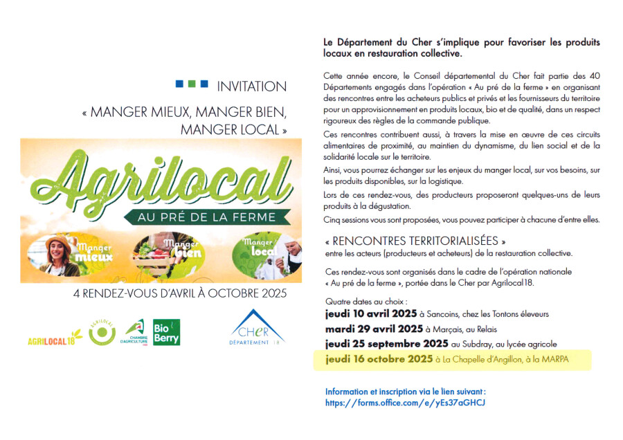 le Conseil Départemental du Cher, en partenariat avec la Chambre d'agriculture du Cher et BioBerry organisent des rencontres territorialisées entre les acteurs (producteurs et acheteurs).