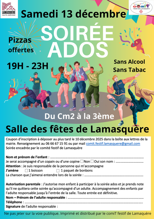Le Comi't Festif t'invite à la soirée des Ados ( du CM2 à la 3ème) :