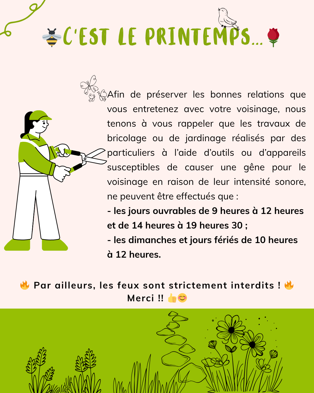 Afin de prĂ©server les bonnes relations que vous entretenez avec votre voisinage, nous tenons Ă vous rappeler que les travaux de bricolage ou de jardinage rĂ©alisĂ©s par des particuliers Ă lâaide dâoutils ou dâappareils susceptibles de causer une gĂȘne pour le voisinage en raison de leur intensitĂ© sonore, ne peuvent ĂȘtre effectuĂ©s que :