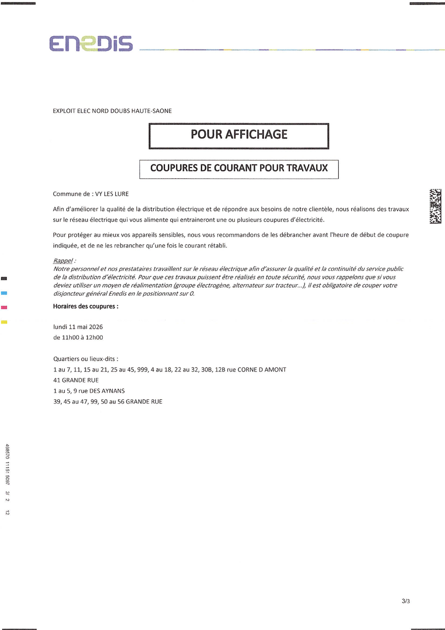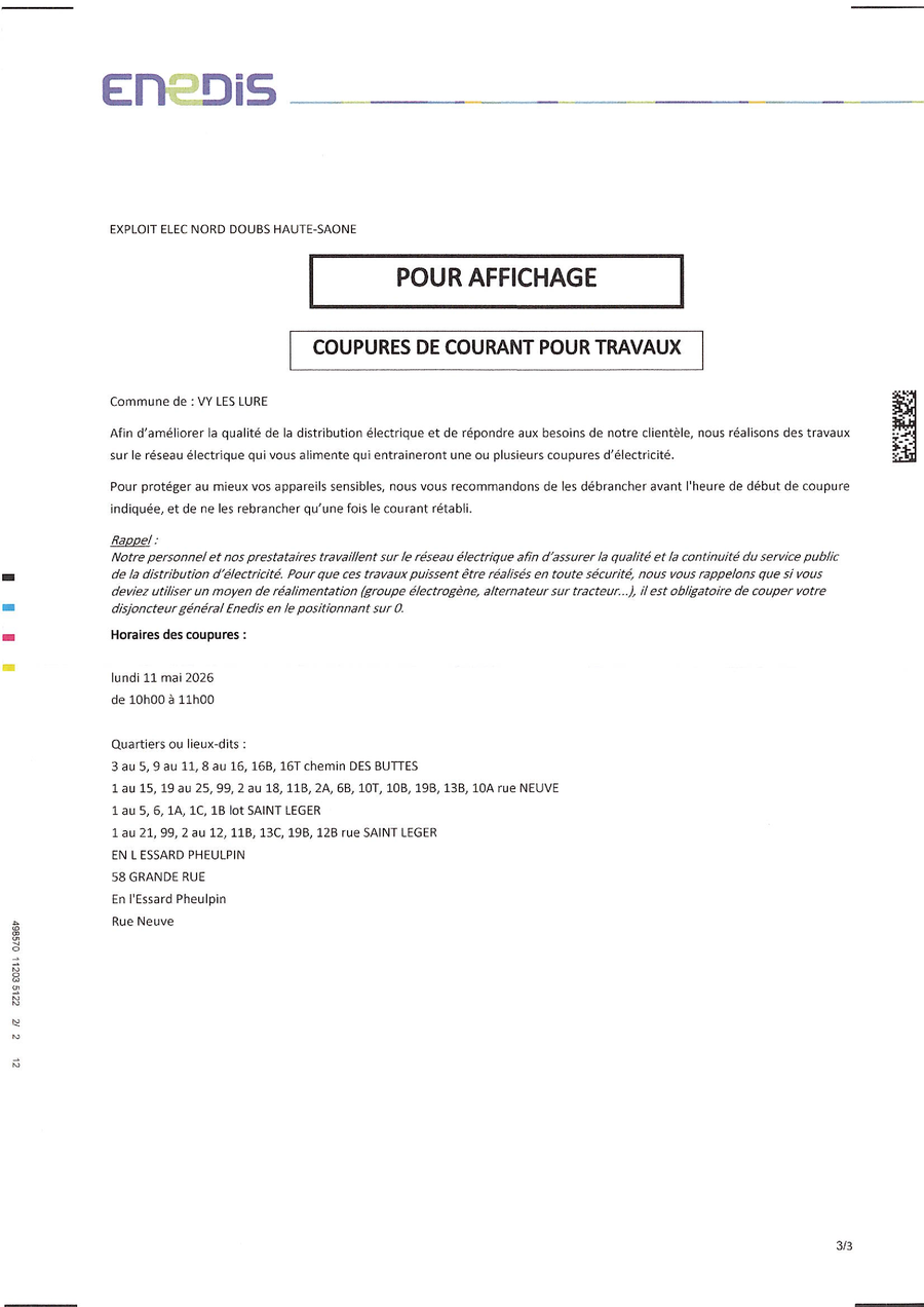 ENEDIS nous informe qu'une coupure de courant est prévue :
