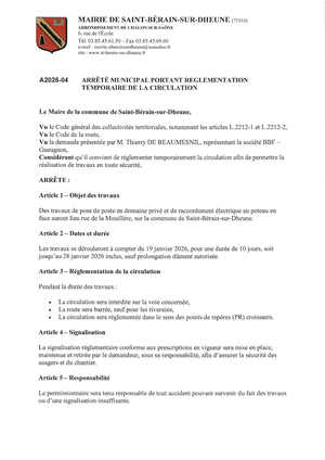 En raison de la pose d'un poste électrique sur domaine privé avec raccordement à une installation photovoltaïque, la circulation sera interdite à compter du 19 janvier et pour une durée de 10 jours, chemin de la Mouillère.