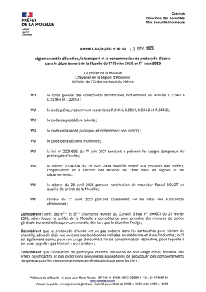 Arrêté Préfectoral réglementant la détention, le transport et la consommation de protoxyde d'azote dans le département de la Moselle du 17 février 2026 au 1er mars 2026.