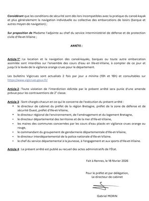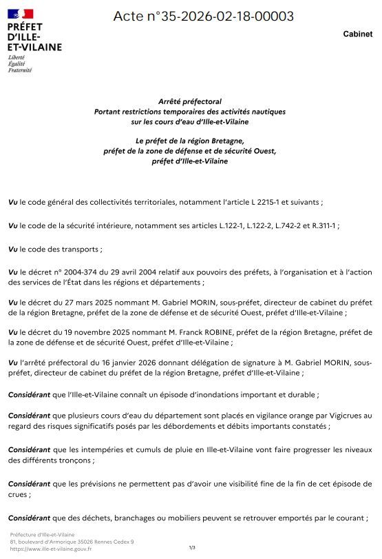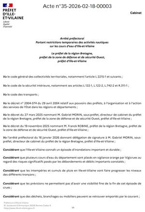 Arrêté préfectoral portant interdiction des activités nautiques sur les cours d'eau en Ille-et-Vilaine.