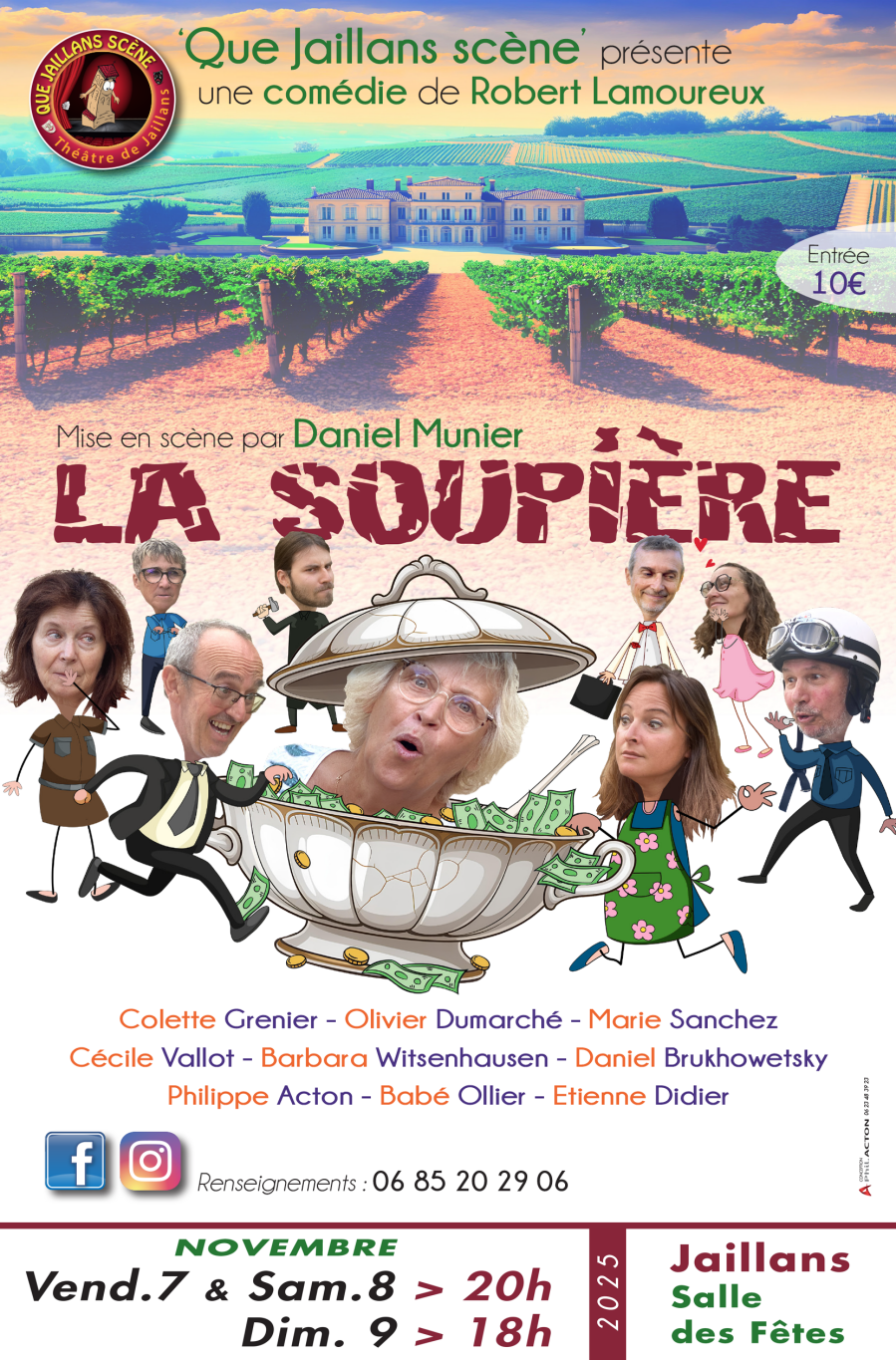 Dans un manoir, la tante Dubard, affectueusement surnommée "La Soupière", devient l'objet de convoitise. Les membres de la famille, surtout le neveu Paul ayant des problèmes financiers avec son usine de robinets, sont prêts à tout pour s'emparer de l'héritage, ourdissent des plans machiavéliques. Entre rires et frissons, cette pièce vous plongera dans un univers où l'amour familial se mêle à la trahison.