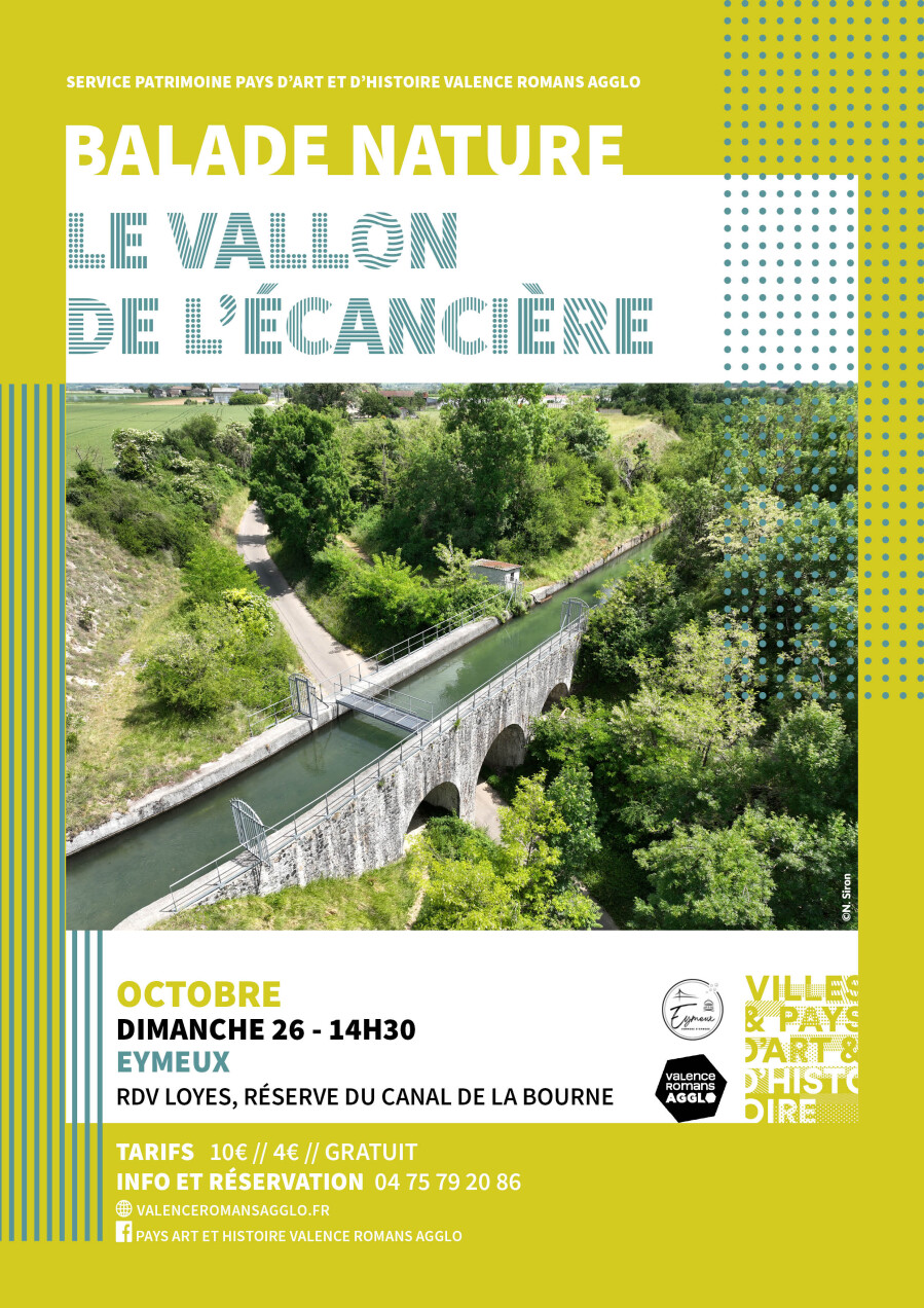 Dans le cadre de la programmation d’automne hiver du Pays d’art et d’histoire, Valence-Romans Agglo propose une randonnée patrimoine dans le vallon de l’Ecancière pour le dimanche 26 octobre après-midi (14h30-17h). Rdv à 14h30 à l'écancière quartier des Loyes , en face de la réserve du canal de la Bourne !