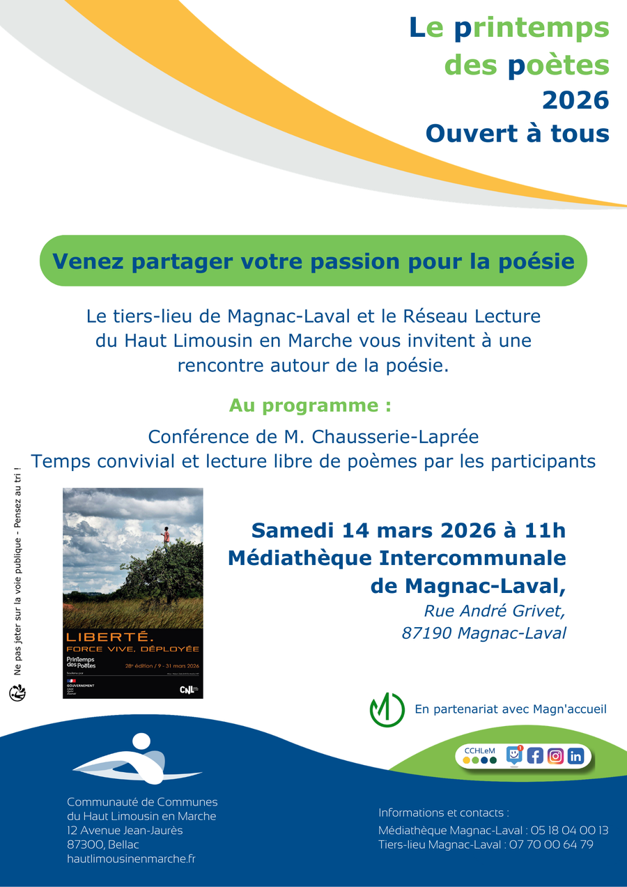 Le tiers-lieu de Magnac-Laval en collaboration avec le Réseau Lecture de la CCHLeM vous invitent à partager un moment dédié à la poésie.