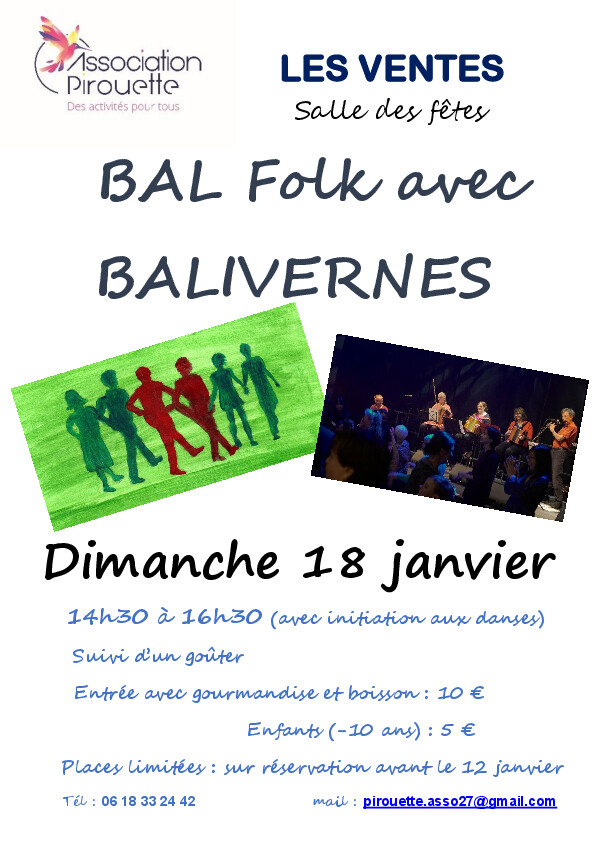 L'Association Pirouette organise le dimanche 18 janvier 2025 à la salle des Fêtes des Ventes de 14h30 à 16h30 un bal Folk animé par le groupe Balivernes (3ème édition)