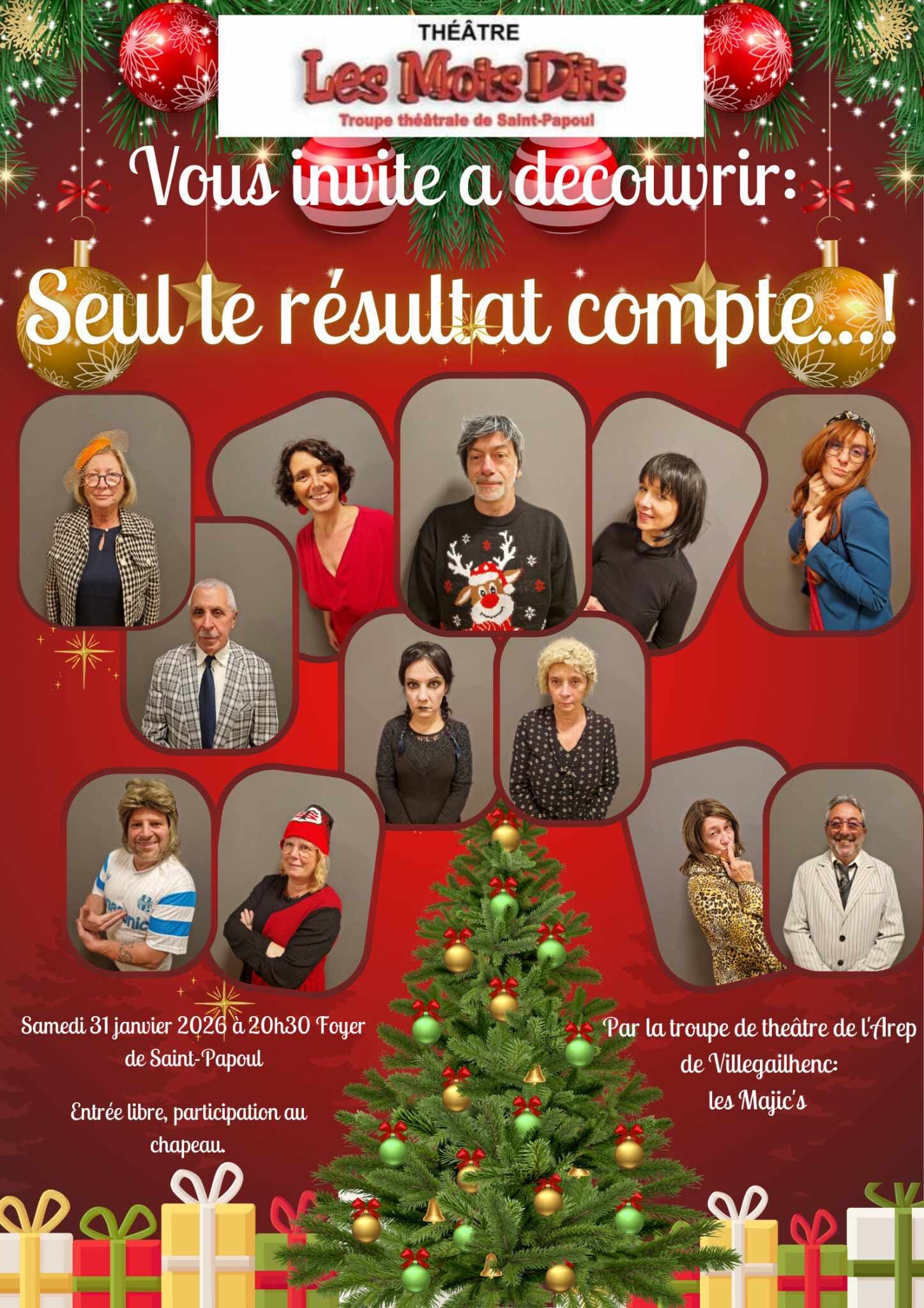 La troupe des mots dits de Saint Papoul a la plaisir d’accueillir la troupe de théâtre de Villegailhenc "les Majics" le samedi 31 janvier 2026 à 20h30 à la salle des fêtes.