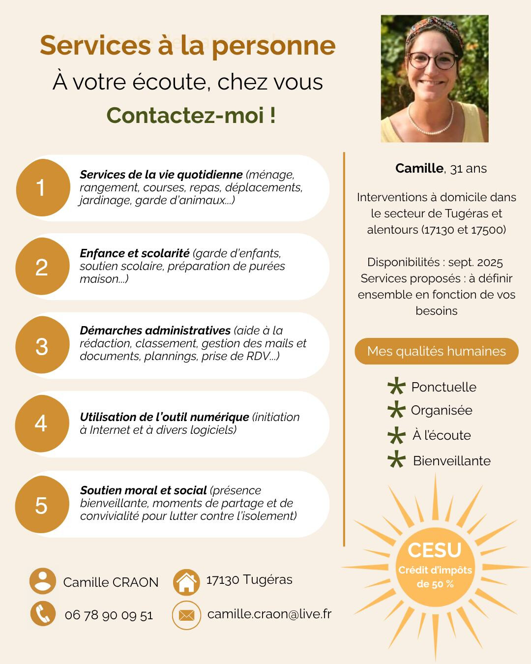 je m’appelle Camille, j’ai 31 ans et je propose mes services d’aide à domicile sur mesure, avec sérieux, écoute et bienveillance, dans un rayon de 10 km autour de Tugéras et Fontaines d’Ozillac (17130 et 17500).
