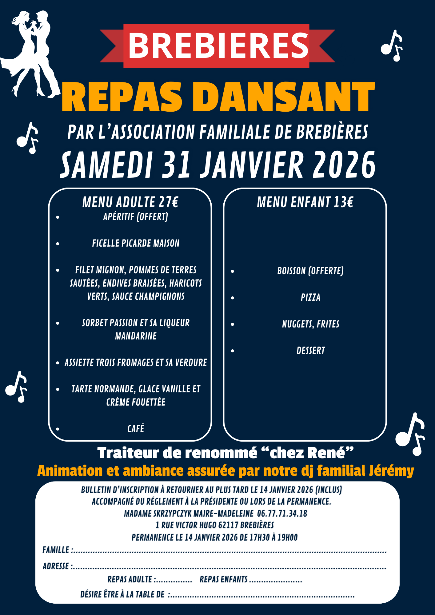 un repas complet et gourmand, préparé par un nouveau traiteur, une ambiance musicale assurée par le DJ familial Jérémy, et une soirée placée sous le signe de la bonne humeur et du partage.