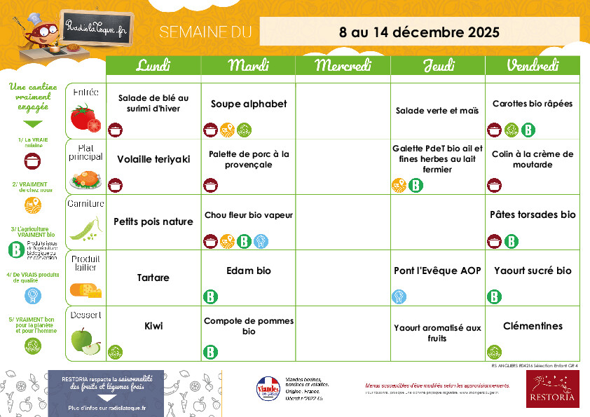 Voici les menus pour la semaine du 08 au 14 décembre 2025