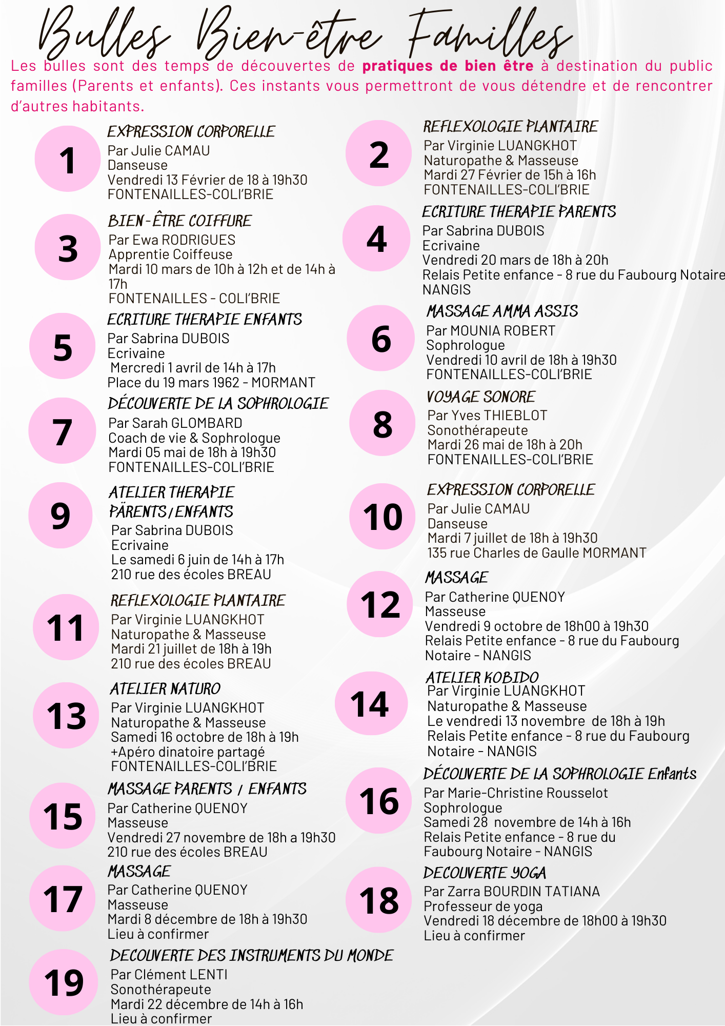 Bulle de bien-être est un moment de détente proposé aux habitants et animé par un prestataire extérieur, professionnel dans le domaine concerné (relaxation, massage bien-être, sophrologie, etc.). Ces temps ont pour objectif d’offrir une parenthèse de bien-être accessible à tous.