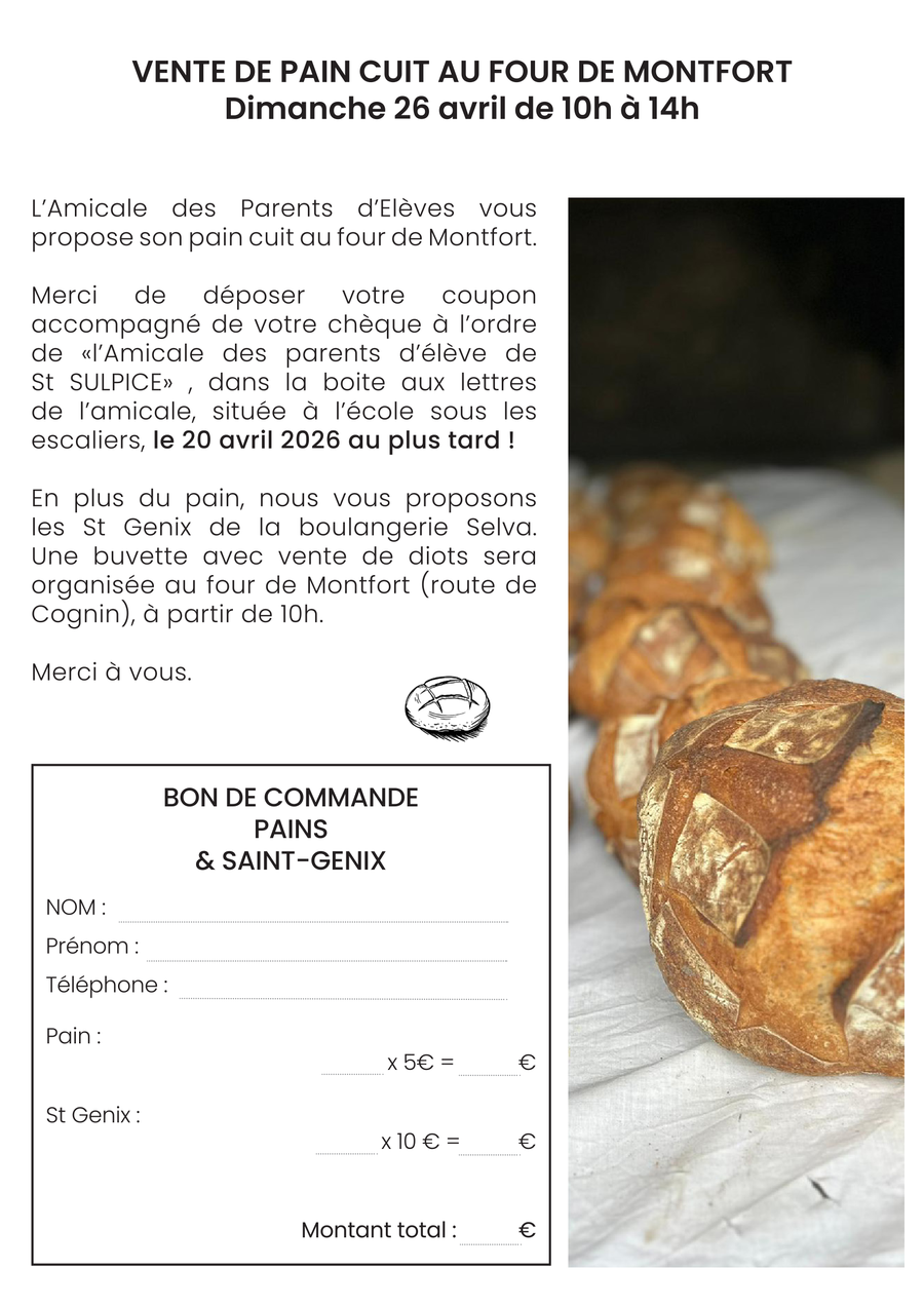 🎉 L'amicale des Parents d'Elèves propose son pain cuit au four de Montfort le
