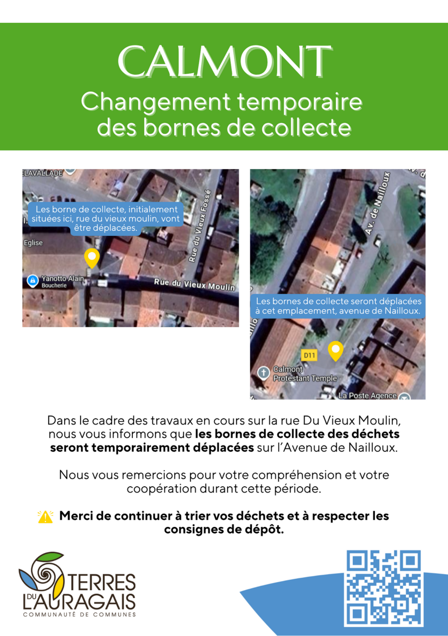 ♻️ Les containers à déchets ménagers et emballages seront temporairement déplacés avenue de NAILLOUX (derrière la Halle).
