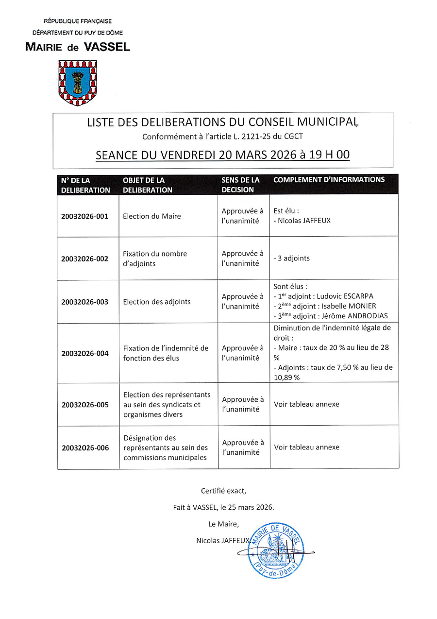 Voici la liste des délibérations du Conseil Municipal de VASSEL, prises lors de la réunion d'installation du 20/03/2026