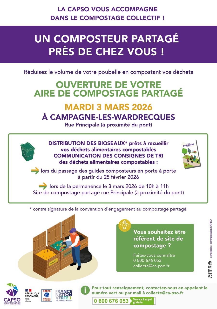🚪 Des agents Guides Composteurs de la CAPSO feront du porte-à-porte à partir du 25 février pour distribuer les bioseaux, clés d'accès au composteur 🔑 et communiquer les consignes d’utilisation