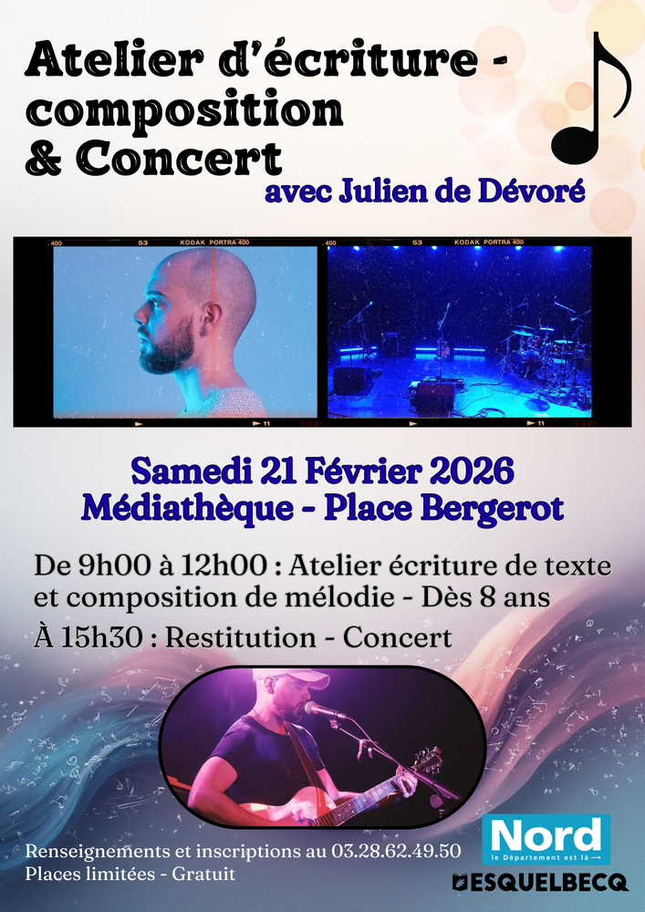 Le samedi 21 février, la médiathèque propose un atelier d'écriture de texte mené par Julien de "Dévoré" (écrire, composer la mélodie et restituer une chanson en 3 heures) de 9h à 12h 🎤🎧🎼