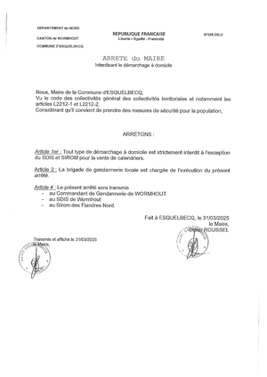 Pour rappel, Monsieur le Maire a pris un arrêté interdisant le démarchage commercial en porte-à porte