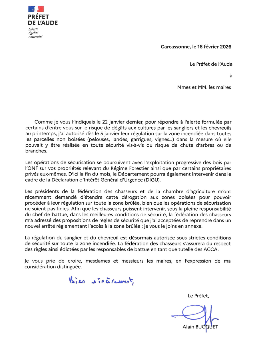 Suite à l’arrêté préfectoral paru hier, la zone brûlée est rouverte à la chasse à des fins de régulation.