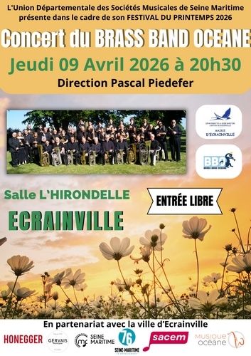 Vous trouverez ci joint l'affiche du concert Brass Band Océane qui aura lieu le jeudi 9 avril à 20h 30 à la salle Hirondelle