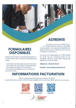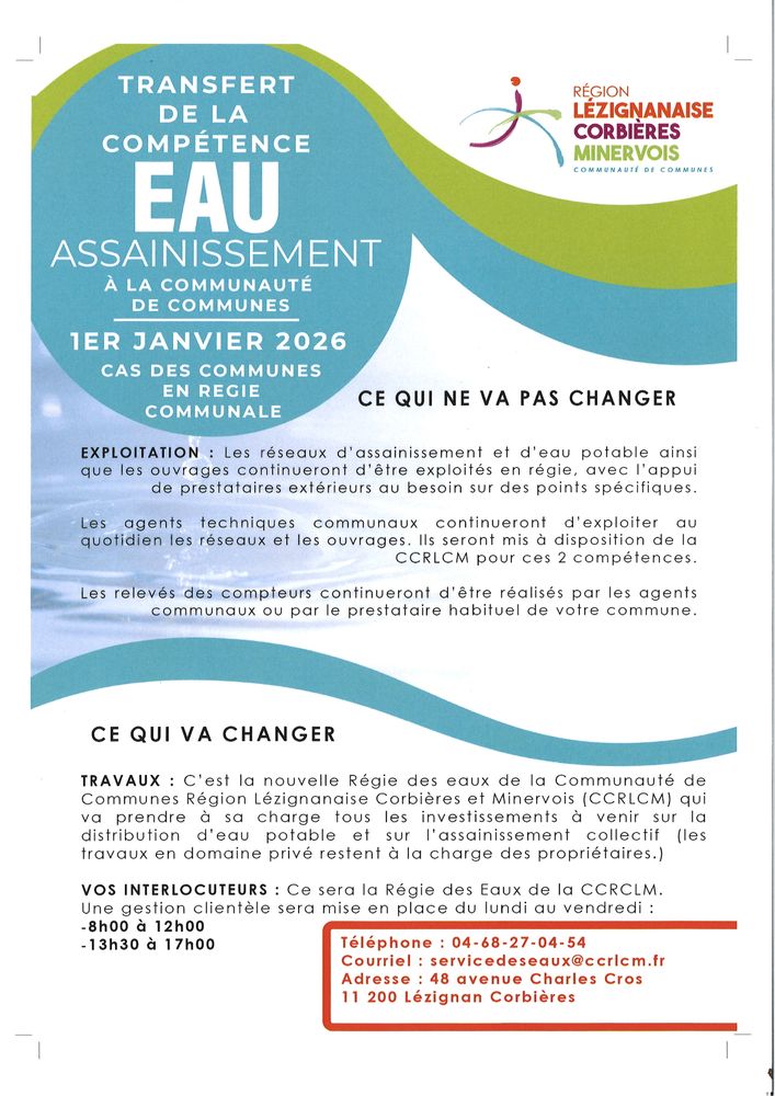 À compter du 1er janvier 2026, la compétence eau potable et assainissement est transférée à la Communauté de Communes Région Lézignanaise Corbières Minervois.
