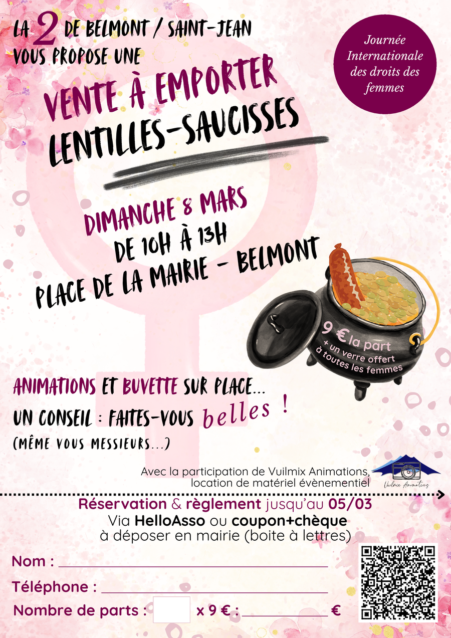 La classe en 2' vous donne RDV à sa vente à emporter Lentilles-Saucisses le 8/3 prochain avec animations sur le thème de la journée du droit des femmes. Ambiance féminine garantie !