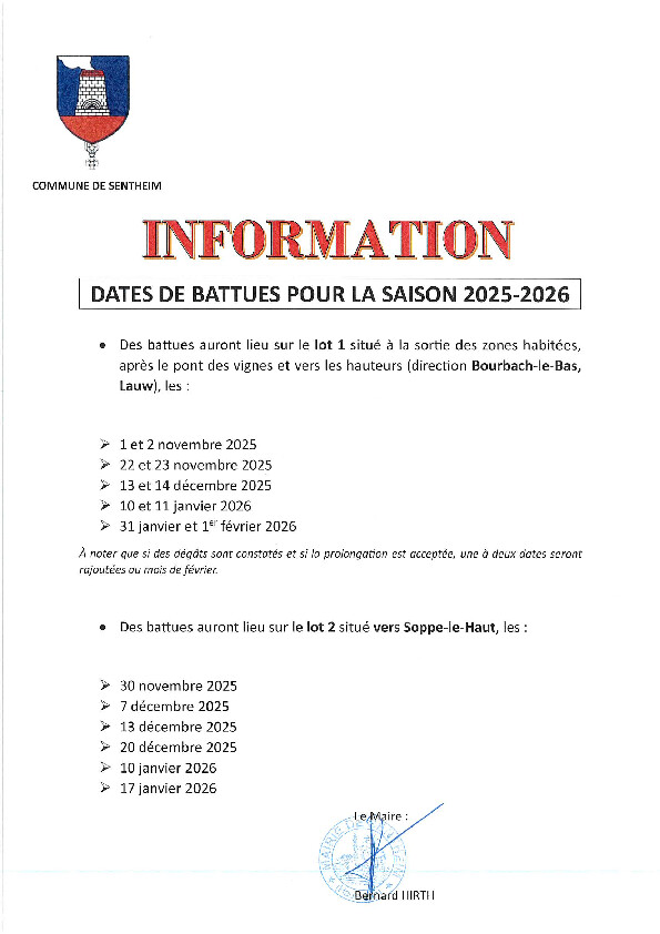 Faisant appel à votre plus grande vigilance, veuillez noter les dates des prochaines battues de chasse dans votre commune :