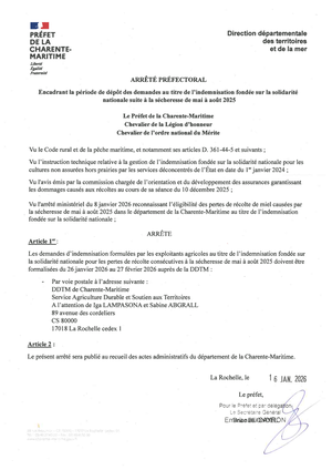 La demande d'indemnisation accompagnée des pièces justificatives est à adresser par courrier postal à la DDTM de la Charente-Maritime du 26 janvier 2026 au 27 février 2026, à l’adresse suivante :