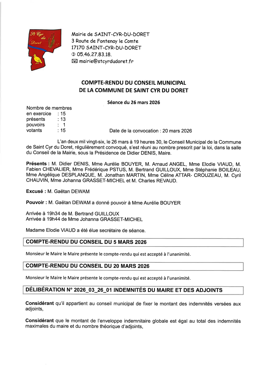 Compte-rendu réunion du conseil du 26 03 2026