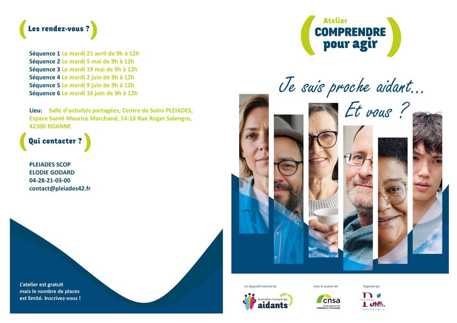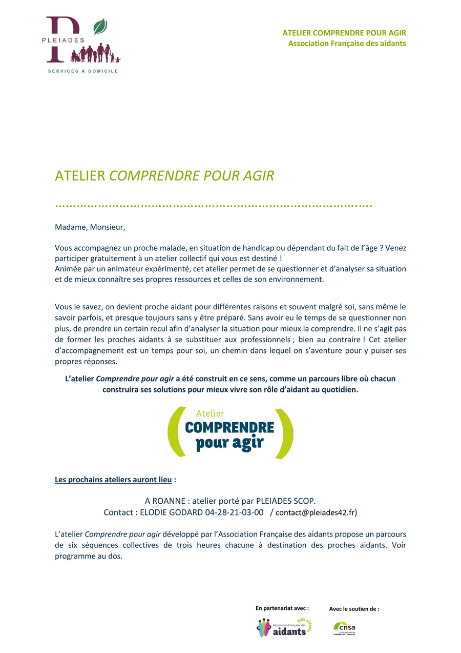 Pléiades scop organise en partenariat avec l'association française des aidants, des ateliers de 6 séquences auxquelles chaque aidant doit participer.