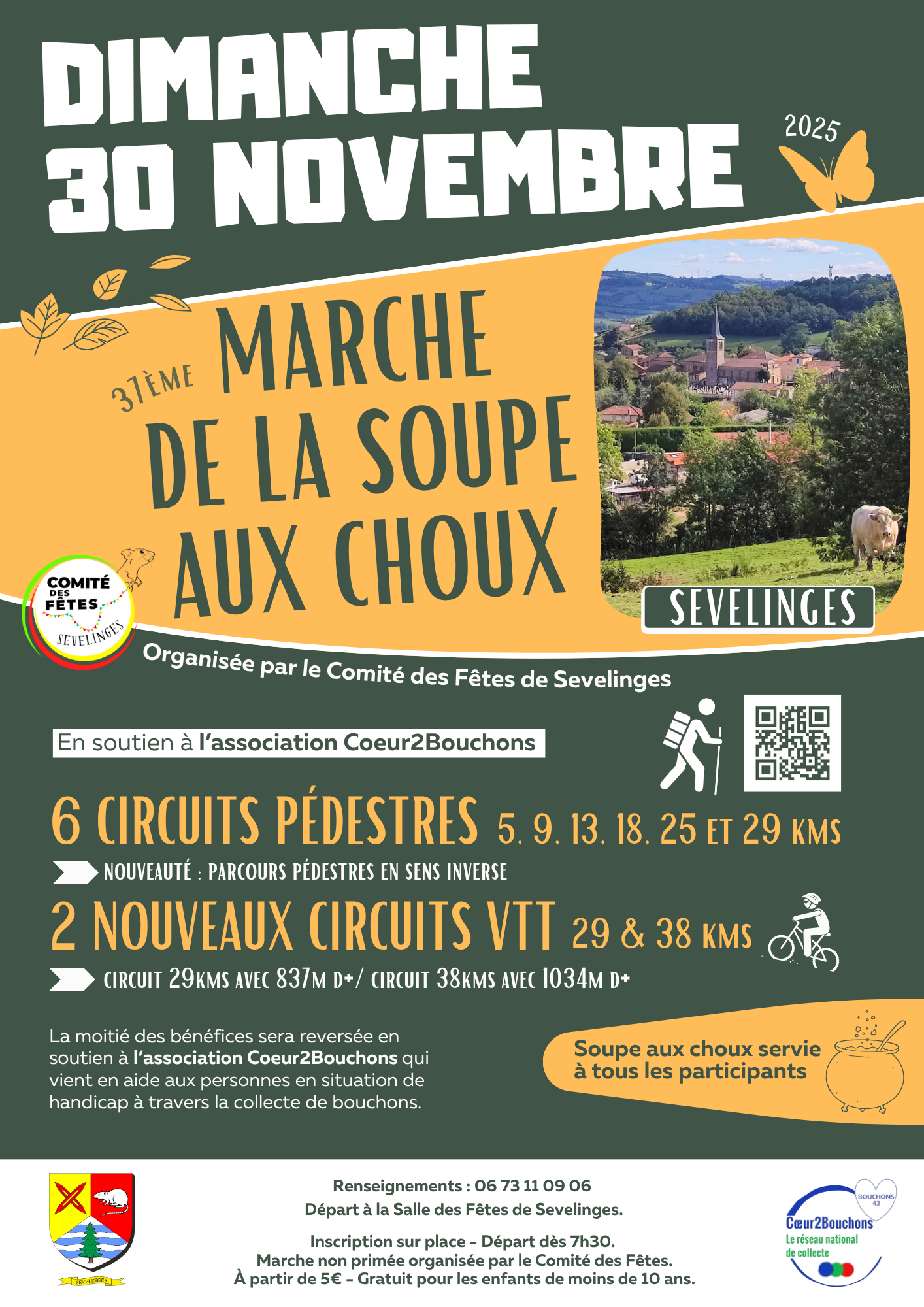 Le Comité des Fêtes de Sevelinges vous donne rendez-vous le dimanche 30 Novembre 2025 pour la 37ème édition de la Marche de la soupe aux choux à Sevelinges !