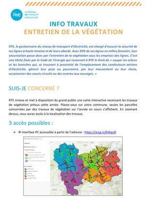RTE innove et met à disposition du grand public une carte interactive recensant les travaux de végétation prévus cette année. Pour les consulter et voir quelles parcelles sont concernées, cliquez sur le lien suivant (en utilisant CTRL+clic gauche) : LIEN VERS LA CARTE