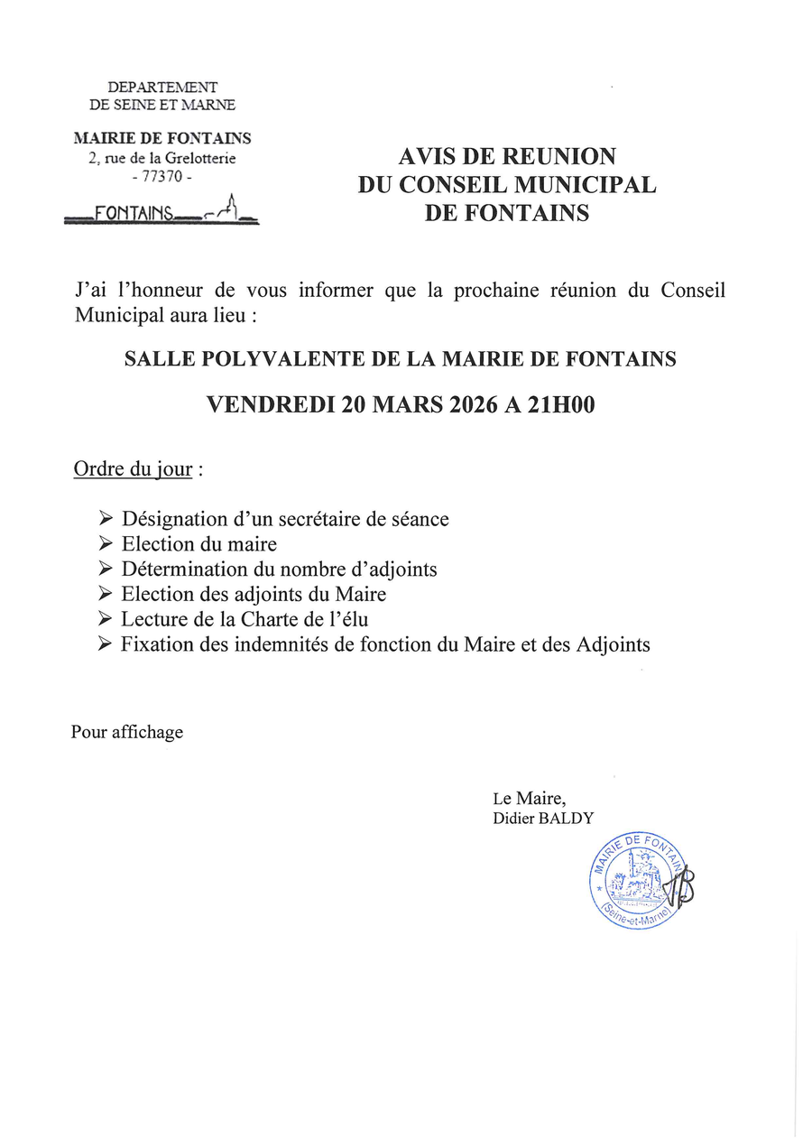 Avis de réunion du Conseil Municipal de Fontains