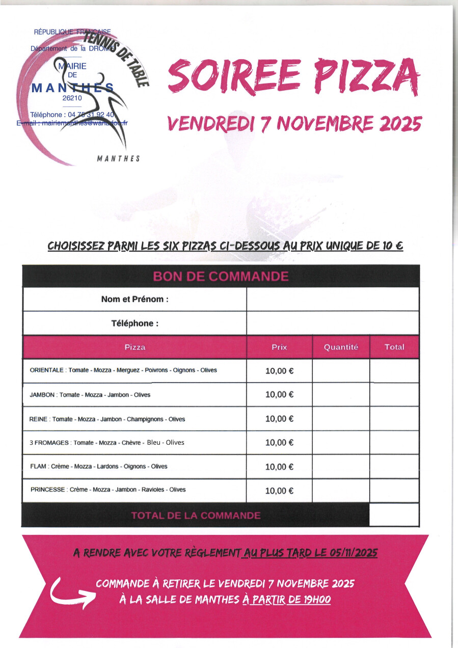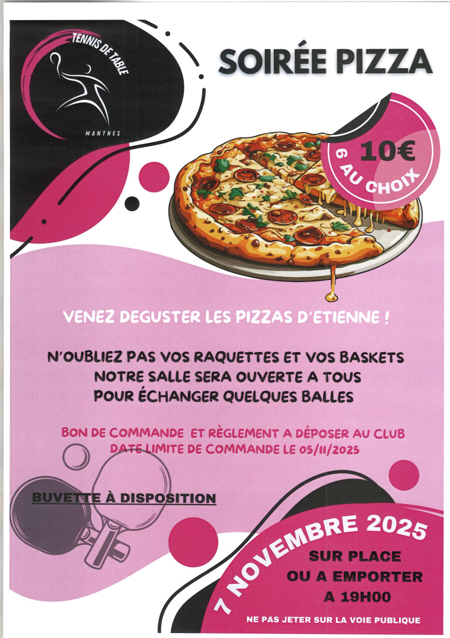 Le club de Tennis de Table organise une soirĂ©e âPizzaâ conviviale le vendredi 07 novembre 2025 Ă partir de 19h00 tout en permettant de jouer au Ping.