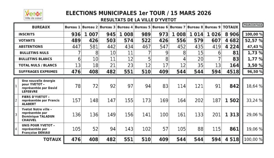 Retrouvez le tableau en intégralité sur https://www.yvetot.fr/resultats-du-premier-tour-des-elections-municipales