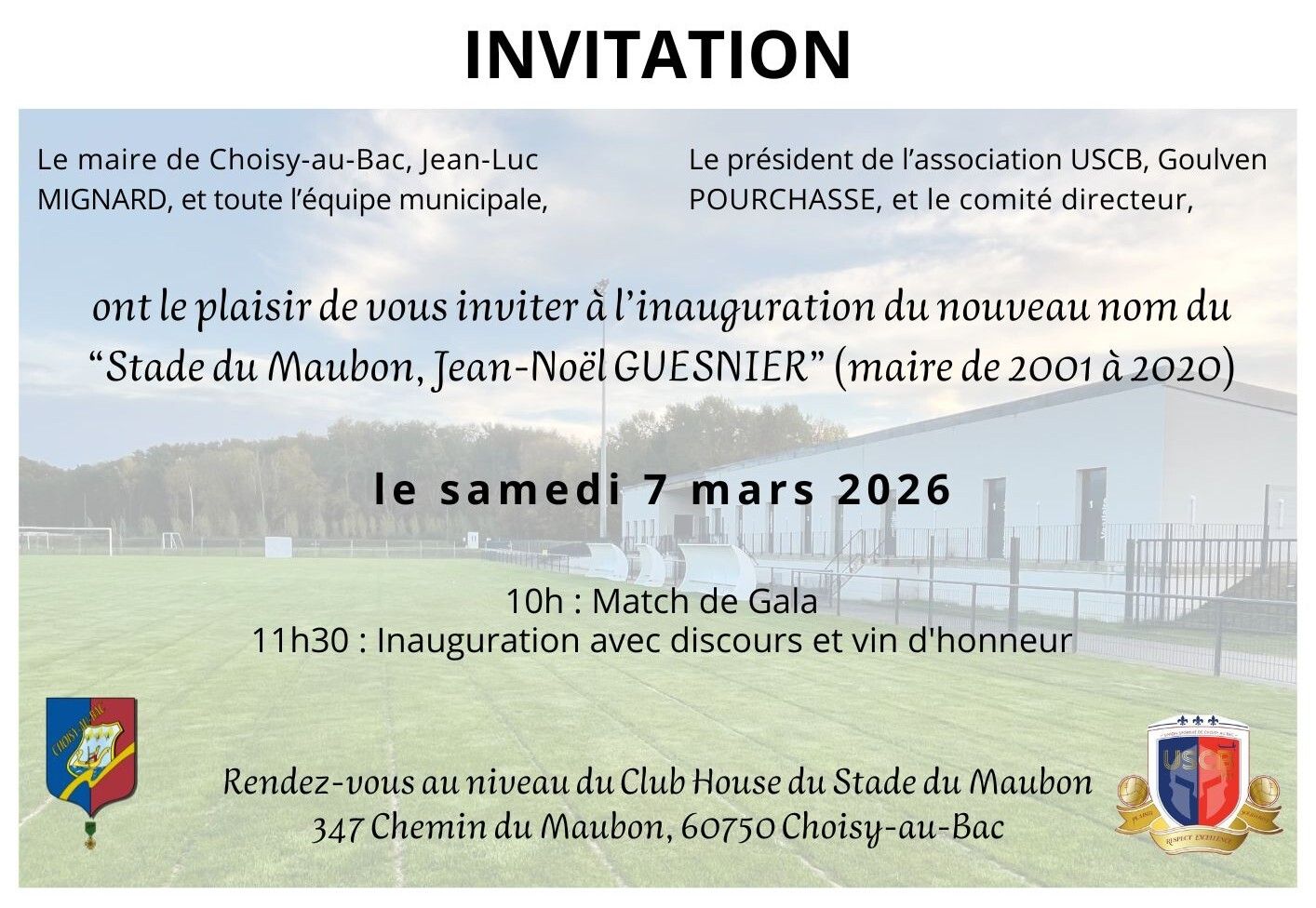 ont le plaisir de vous inviter à l’inauguration du nouveau nom du « Stade du Maubon, Jean-Noël GUESNIER » (maire de 2001 à 2020)
