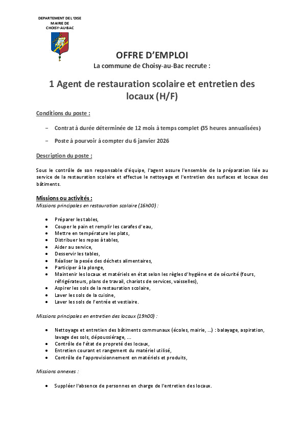 Envoyer lettre de motivation et CV à l’attention de Monsieur le Maire de Choisy-au-Bac, 2 Rue de l'Aigle - 60750 Choisy-au-Bac, ou par e-mail à rh@choisyaubac.fr