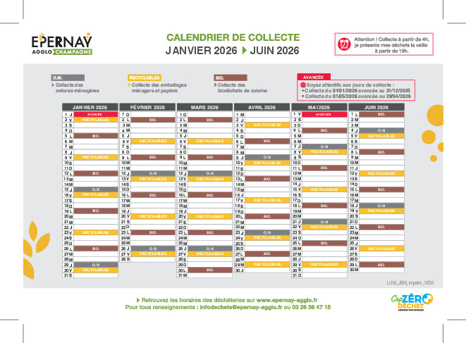 Calendrier de collecte des déchets 2026 pour les rue de Chavot, ruelle du Haut Montcetz, et rue du Maltrait