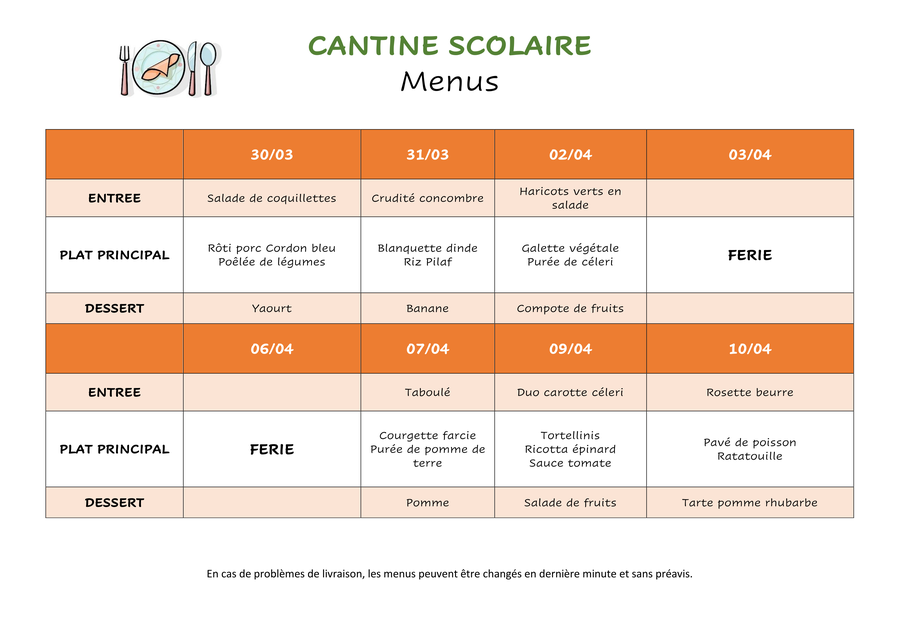 Menus du 30 mars au 10 avril 2026