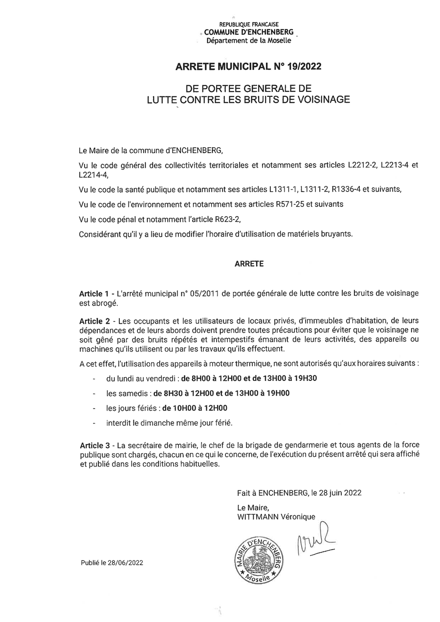 Un arrêté municipal pris le 28/06/2022 afin de réglementer les horaires d'utilisation de matériel bruyant.