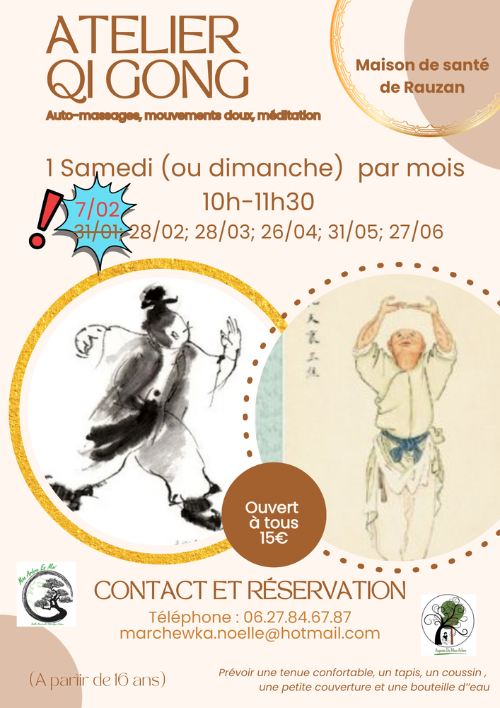 Prenez soin de vous en douceur ! La Maison de santé de Rauzan vous propose un atelier Qi Gong chaque mois, le samedi ou dimanche de 10h à 11h30. Auto-massages, mouvements doux et méditation sont au programme pour vous offrir un moment de relaxation profonde. Prochaine séance le 7 février (remplaçant le 31 janvier), puis les 28/02, 28/03, 26/04, 31/05 et 27/06. Atelier ouvert à tous à partir de 16 ans, pour 15€ la séance. Pensez à prévoir une tenue confortable, un tapis, un coussin, une petite couverture et une bouteille d’eau. Réservez vite votre place au 06.27.84.67.87 ou par mail à marchewka.noelle@hotmail.com. Offrez-vous une parenthèse bien-être ! 🌿🧘♂️