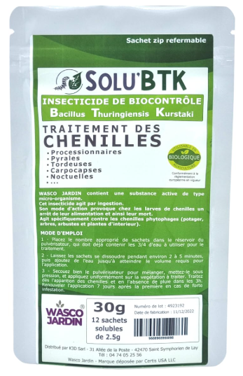Préparation : Diluez le Bt (poudre ou liquide) dans de l’eau en suivant scrupuleusement les instructions du fabricant pour garantir une efficacité optimale.